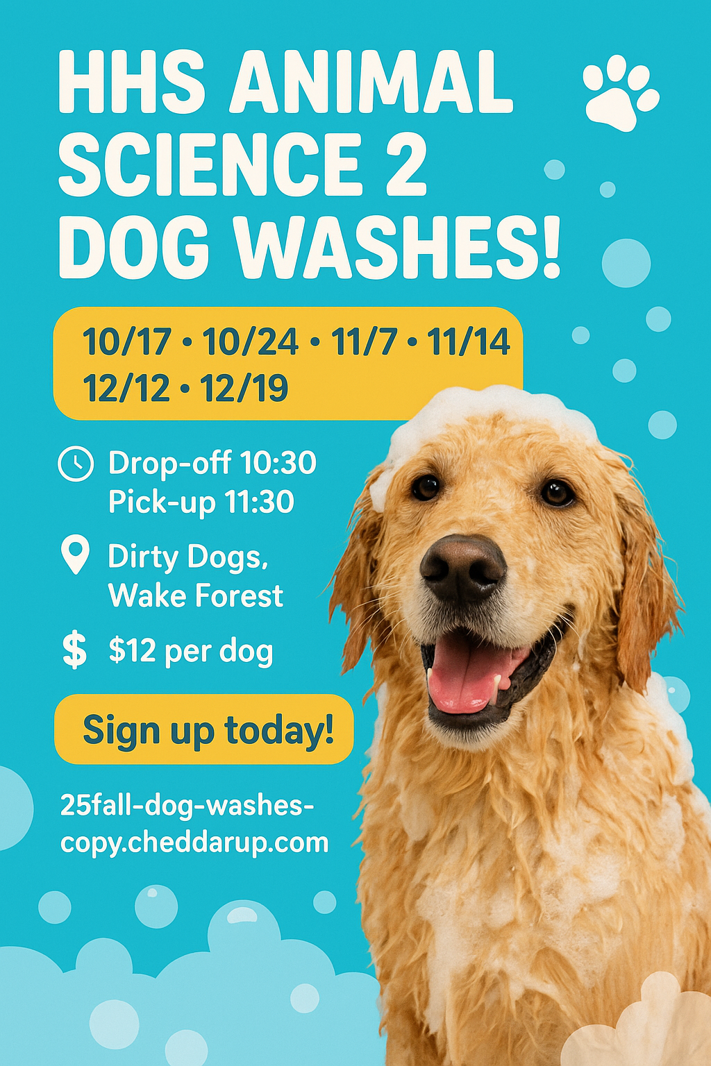 Support our Animal Science 2 students at Dirty Dogs. They will be washing dogs on specified days/times. Link: https://25fall-dog-washes-copy.cheddarup.com