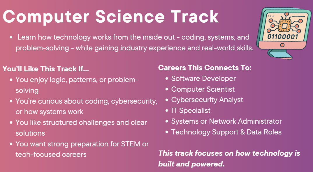 Students in the FVHS Technology have a choice between two distinct technology tracks: Computer Science and Adobe Video Design. See the comparison below: