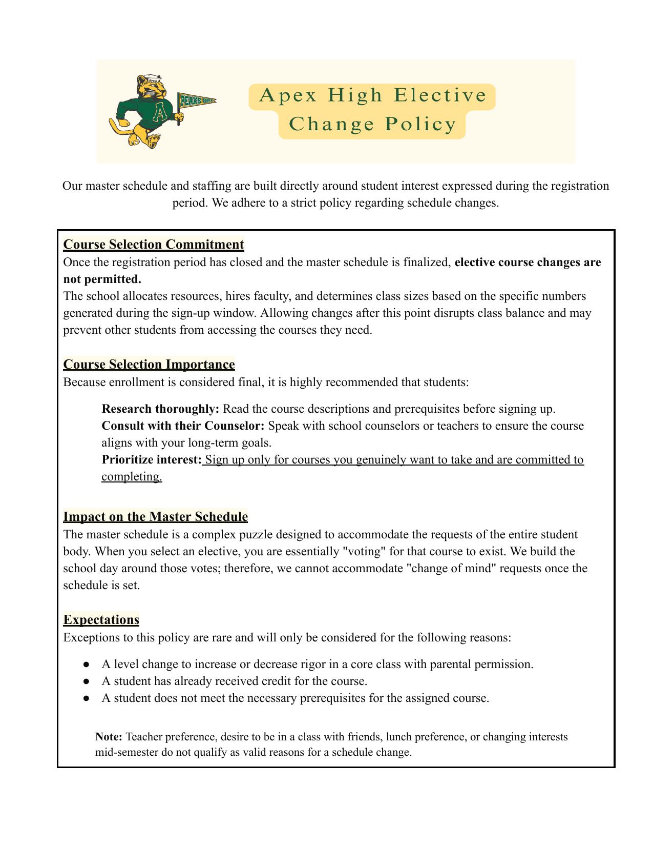 Click HERE for the Apex High School Elective Change Policy.
