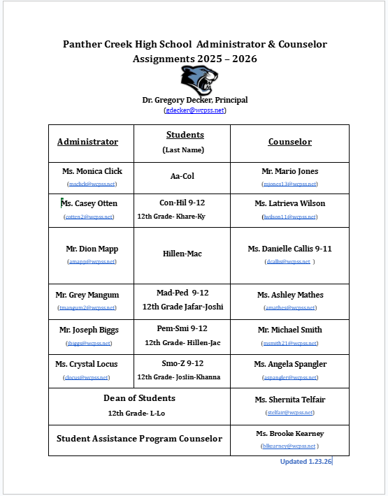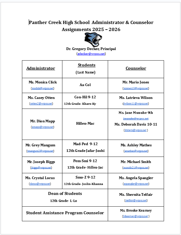 The school counseling program at Panther Creek High School aims to deliver a comprehensive, collaborative, data-driven approach that fosters the holistic development of students across school, family, and community, guiding them to graduate as responsible citizens prepared for post-secondary education, the workforce, and lifelong learning. Our school counseling program is committed to equity by actively addressing and reducing barriers that may hinder student success. Using data to guide our approach, we provide individual, group, and small group counseling sessions, along with appropriate referrals when necessary, to ensure that all students have fair and meaningful access to the support they need to thrive. Through strong partnerships with stakeholders, we strive to create an inclusive and supportive environment that fosters 21st-century student engagement, academic achievement, and the well-being of all students.