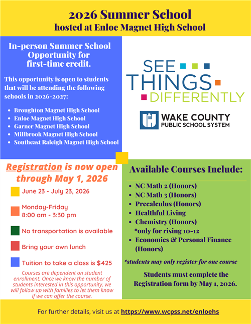 Wake County Public School System is offering an in-person summer school opportunity hosted at Enloe Magnet High School for students to earn first-time credit in a course. This registration request form will be available through May 1, 2026