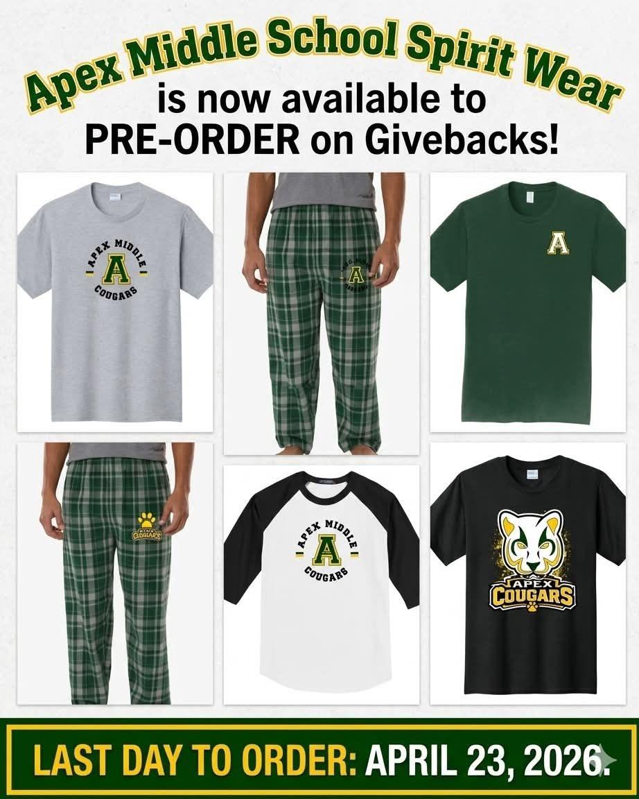 Ready to show your Apex Middle School pride in style? Spirit wear is officially open for pre-order, and you won’t want to miss out! From classic favorites to cozy must-haves, there’s something for every Cougar.