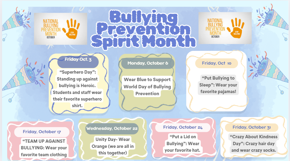 October is recognized as Bullying Prevention Month, serving as a powerful reminder of the importance of kindness. Each day, we have the opportunity to model and encourage respect, empathy, and compassion in our classrooms. On select days, we will hold Spirit Days. Please see the chart below.