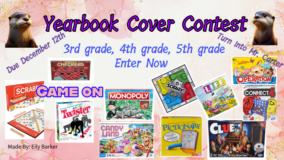 The Yearbook Cover Contest is officially open! It is open to all students in grades 3-5. This year's theme is "Game On"! Remember that the works must be neat, in full color, and that you can mix different techniques. The works must be delivered to Mr. Carter by December 12.