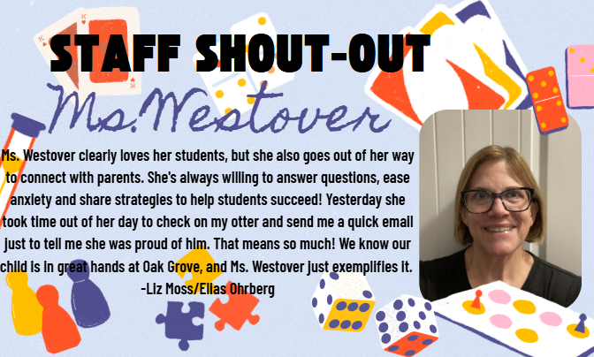 During this season of thanks, we want to extend our heartfelt appreciation to each of you for your generosity and support during our new underwear and coat drive, as well as for your assistance in helping families during the holidays. Your kindness makes a tremendous difference in our community. Additionally, we are grateful for your joining us in recognizing and celebrating Dr. Loehman, our School Psychologist, and Ms. Bocciardi, our Intervention Facilitator/Teacher. Your continued partnership and appreciation of our staff help make Oak Grove such a special place for our students.