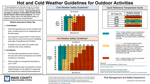 Oak Grove follows the hot and cold weather guidelines for outdoor activities to determine whether students will have outdoor recess. Please remind your child to dress appropriately for the weather, as this is also a factor teachers consider when the weather is in the yellow zone on the weather guidance.